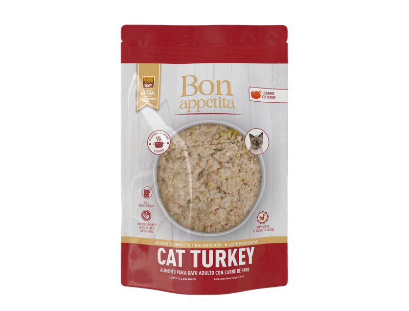 Bon Appetita es un alimento natural para gatos, completo y balanceado, preparado con ingredientes seleccionados y cocción al vapor, diseñado para brindar una nutrición de alto valor en un formato práctico y fácil de servir.